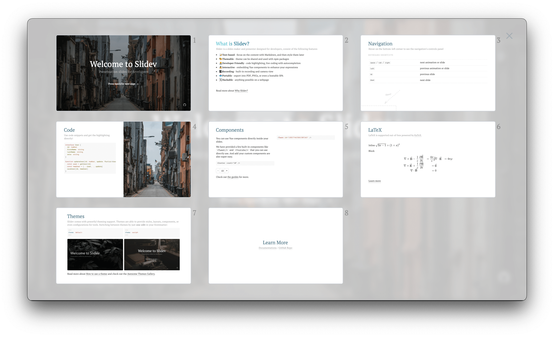 You can visit an overview of all of your slides by first opening the Quick Overview panel and then clicking the on the top right, or by visiting http://localhost:<port>/overview directly.